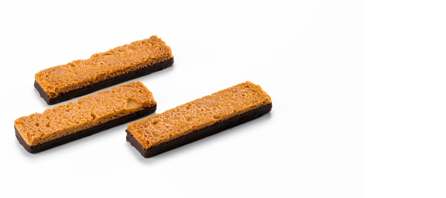Once the biscuit is completely frozen, stab with two skewers and dip half way in a bowl of pre-crystallized chocolate.