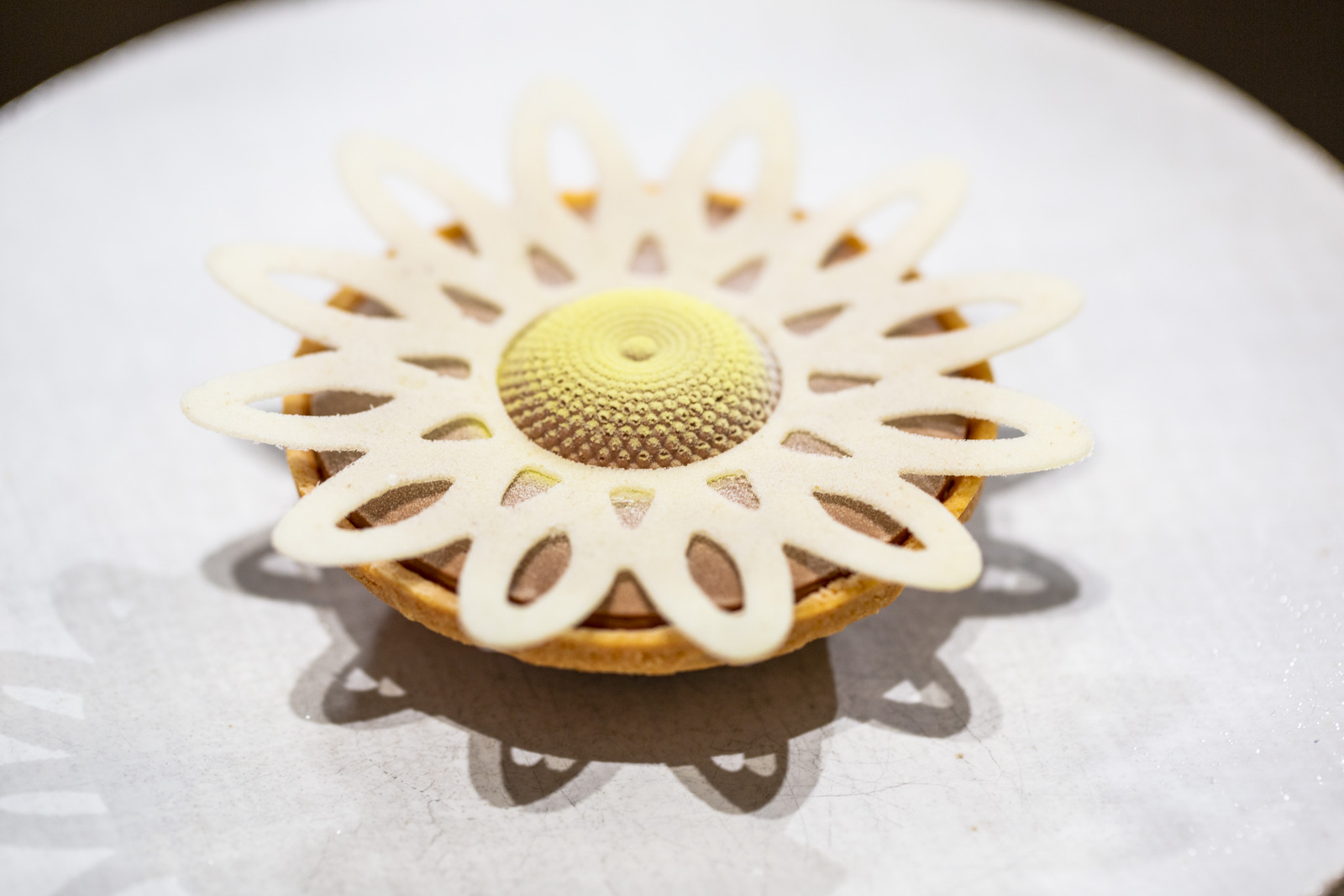 Pipe the Chamomile milk rice to the bottom of the tart. Top with a layer (16g ) Apple confit. Place the cocoa sponge disk over the confit then cover it with the Evocao whipped ganache. |