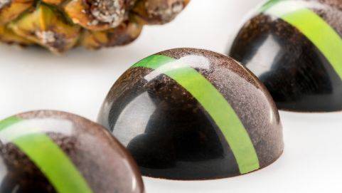 Fundir el chocolate y la manteca de cacao 45ºC, agregarlo al praliné de almendra atemperado a unos 20ºC. |