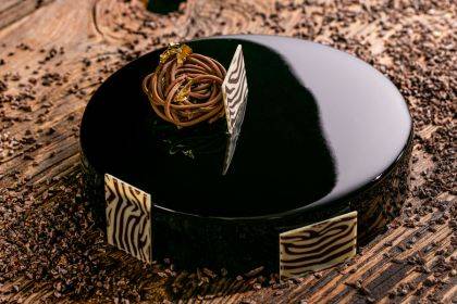 Do formy w kształcie dużego kamienia wlać mus czekoladowy, następnie włożyć krem z yuzu i ponownie mus czekoladowy. Na mus położyć Feuilletine z czarnym sezamem i ponownie mus czekoladowy. Na samej górze położyć biszkopt z nibsami. Całość zamrozić i po wyjęciu z formy zalać polewą. Udekorować czekoladą z czarnym sezamem i dekoracją Maślane Świderki Mona Lisa wykończoną złotem w proszku. |